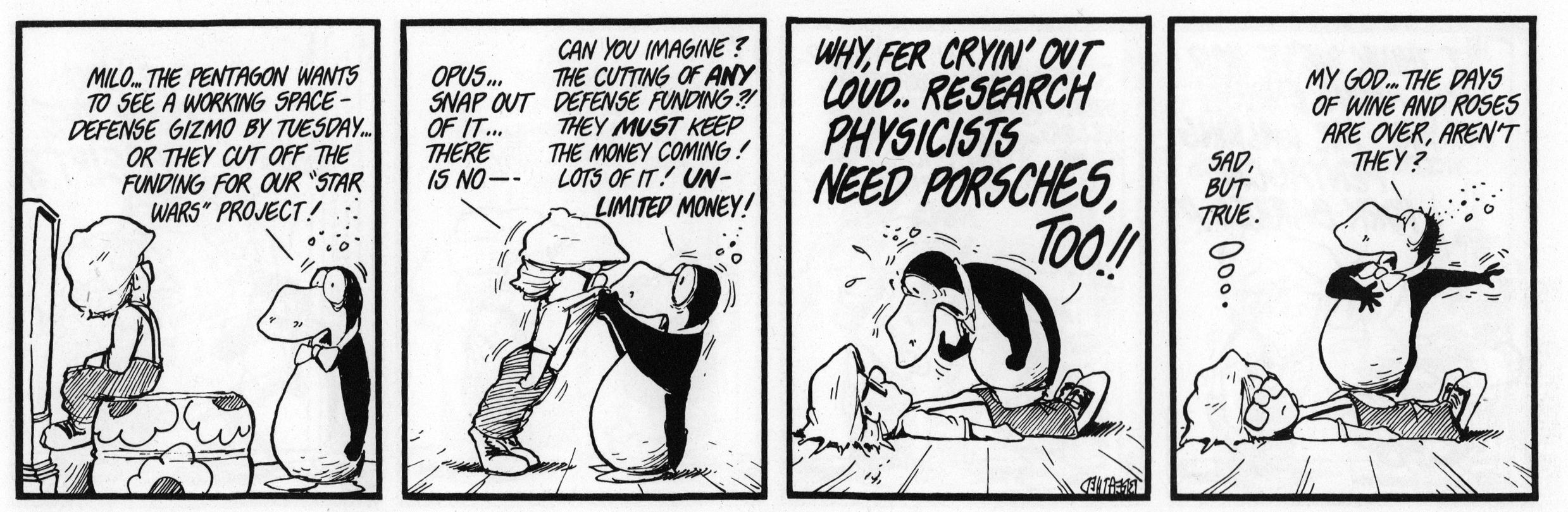 I was sitting at my desk in the E ring of the Pentagon only a short stroll from the office of the Secretary of Defense. It was in February 1985 and one of those miserable rainy days in Washington. I was skimming through the latest outrageous proposal to the Strategic Defense Initiative Office. It was a concept for some sort of nonsense gamma ray laser that could be the death ray that would intercept the Soviet missile attack and protect us if they chose to launch all of their missiles at us. I never was surprised at the ridiculous attacks on the program that was little more than 1 year old and struggling to attract reasonable rather than a series of outlandish comparisons and proposals and even worse attacks on ourcredibility. I had learned to wait for and enjoy the latest Bloom County comic strip that described me as a slightly overweight penguin.
