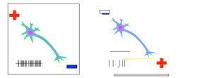 Figure 3. The modulatory effects of DC fields on neurons. When aligned with the neuronal potentials, firing is enhanced (left); when opposed to the neuronal potentials, firing is suppressed (right). (Courtesy E.M. Wassermann.)