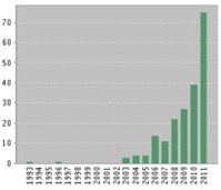 Robertson et al. 2008). While anodal stimulation is most often used, more recent studies are focused on cathodal administration to dampen effects of hyperactive neuronal populations in epilepsy (targeting the epileptic focus) (Fregni, Thome Souza et al. 2006) and migraine (targeting the occipital cortex) (Chadaide, Arlt et al. 2007; Antal, Kriener et al. 2011). tDCS studies have accelerated in the last decade (Figure 4), with nearly 38% of the total studies (N=76) occurring in 2011 alone.